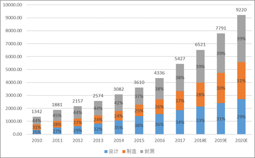 近年国内IC产业高速发展,2010年国内IC行业销售额为1342亿元人民币,2017年实现销售额5427亿元,平均年复合增长率高达22.1%,远高于全球行业整体增速。我们预计未来几年行业增速仍将保持在20%以上。