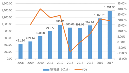 根据数据,2016年和2017年我国集成电路产品产量分别以21.04%和19.46%的增速持续创造新高,2017年总产量已达1391.90亿块。