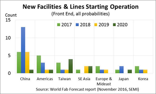 数据显示,2017年-2020年,全球将新建62座晶圆厂投运营运,其中26座落户中国,占比高达42%。2017年中国境内有6座新建的晶圆厂投产,2018年将达到峰值,预计将有多达13座晶圆厂投产。